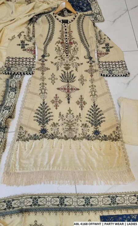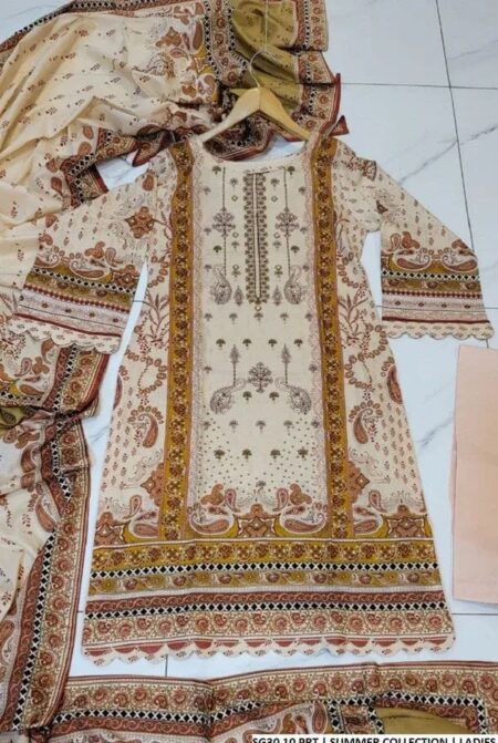 This stylish wear 3-piece stitched lawn suit comes with a finely tailored shirt, matching trousers, and a soft dupatta. A perfect blend of comfort and elegance for casual or semi-formal occasions.